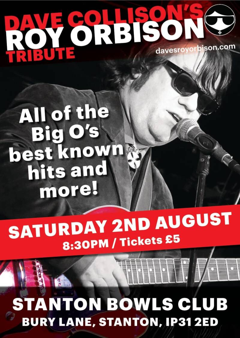 We have Dave Collison's Roy Orbison Tribute coming to Stanton Bowls Club on Saturday 2nd August. Doors open at 7pm with the 1st part starting around 8.30pm. £5.00 entry fee with tickets available to pre book and entry is payable on the door. Please note that we are limited to numbers so please book to avoid disappointment.
